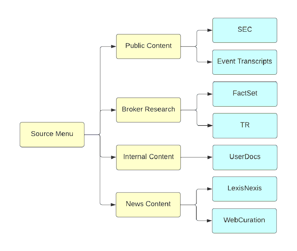 Source Model is used by AlphaSense UI to present the different document sources provided by AlphaSense as well as document categories added by customers but it is not critical for the entitlement and permission workflows. Source menu provides a well structured source tree, which can be extended for client specific content categorization. AlphaSense provides the functionality to incorporate personalized document types. These adaptable document types streamline the categorization process for customers' internal content within our platform's Source menu, allowing users to list a maximum of 9 document types.